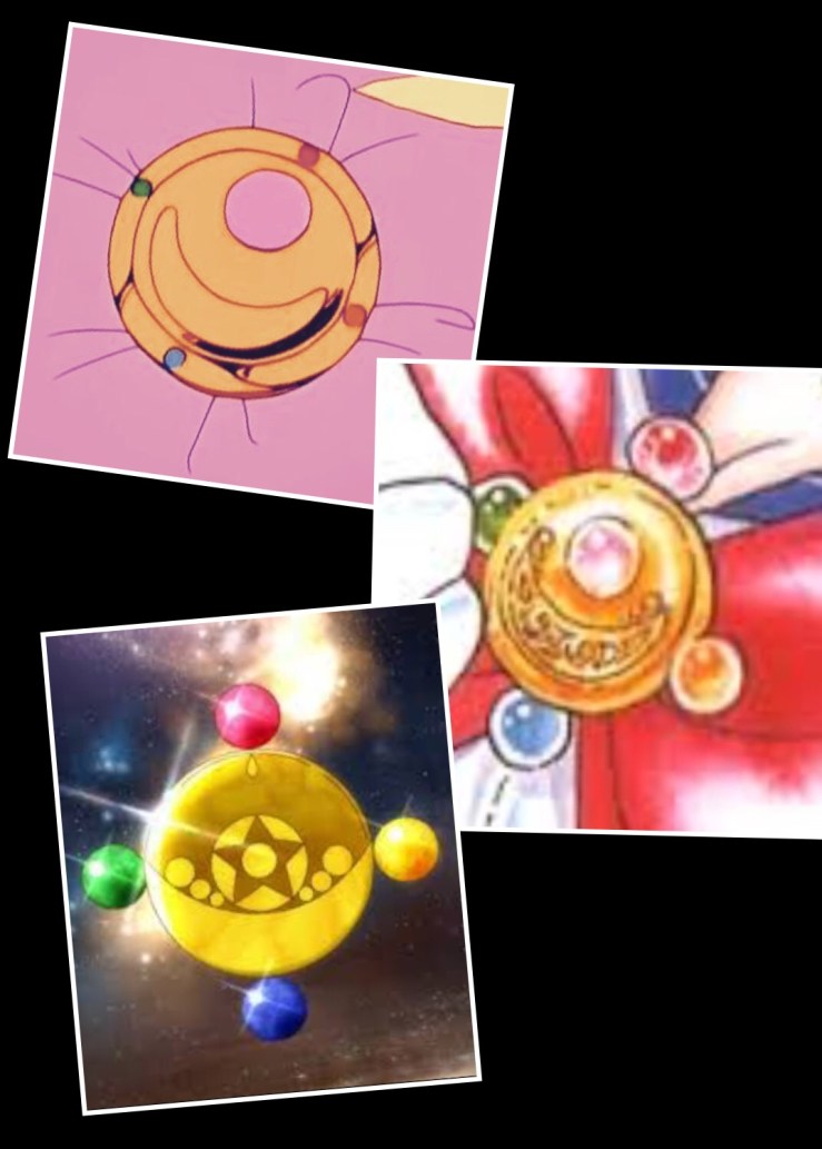 舊代動畫中的胸針設計很可愛,圓滾滾的,中間簡單一個弦月,四個代表四位守護戰士顏色的寶石小小的鑲在四周。