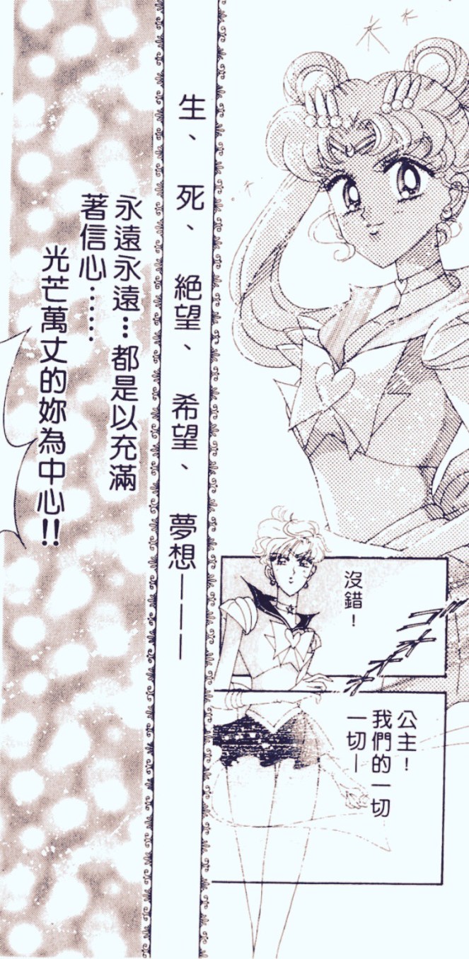 而在SS代,天王星看著從妮黑蕾妮亞噩夢中掙脫出來、眼神堅定的水手月亮時,也說「公主!我們的一切!生、死、絕望、希望、夢想—永遠永遠⋯都是以充滿著信心⋯光芒萬丈的妳為中心!」