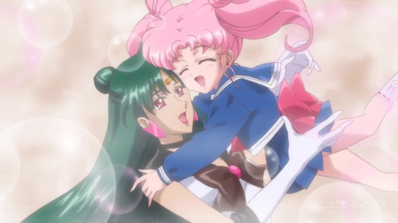 小月亮因為冥王星的死痛哭失聲,水手月亮很憤怒的起身抵抗尼枚西斯,四位守護戰士也跟著放出絕招,大家同心協力對抗敵人。這段我看得好過癮!最喜歡水手戰士們團結一心、集結力量的樣子了。