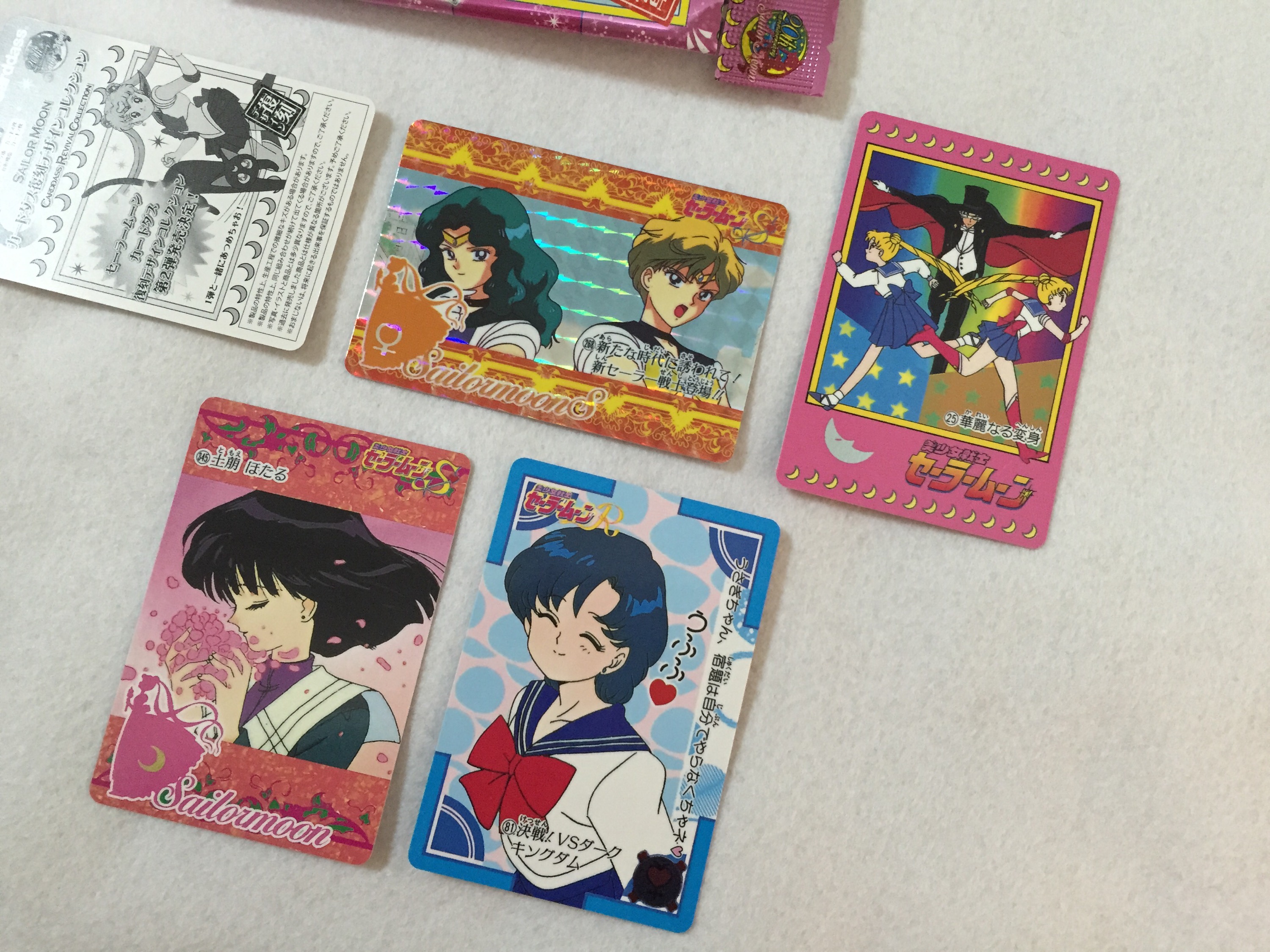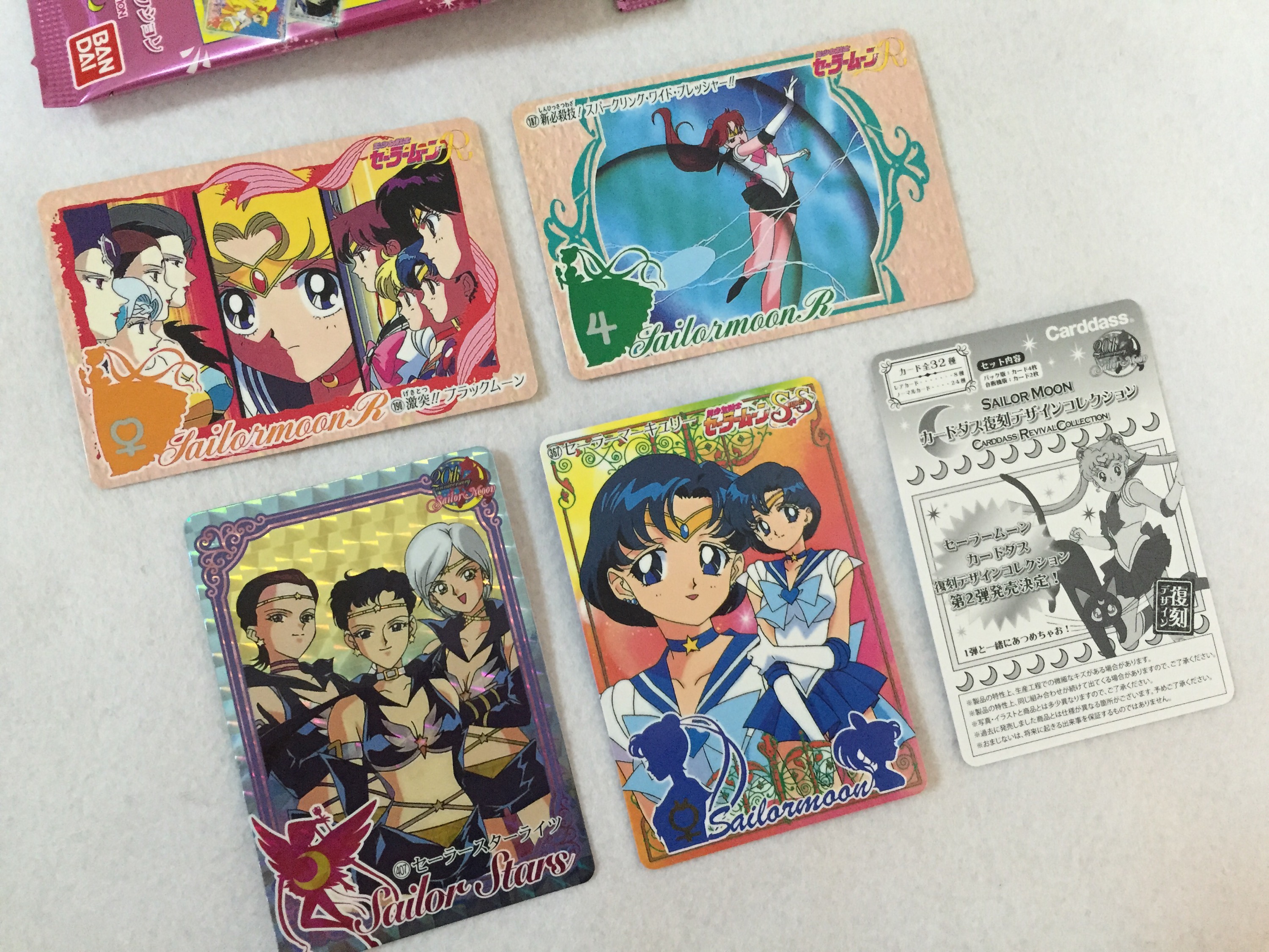 拆的第一包就好美,水星攻擊的那張畫面好漂亮,遙滿的那張是大名鼎鼎流傳千古的「阿遙,我喜歡你的手」的畫面。這包的閃卡是初代的最後一集,小兔對抗梅達利亞女王時,戰死的四戰士靈魂出現借力量給她。初代的最後這兩集(#45、#46)真的畫得很好,到現在我每次看都還是會感動到落淚。