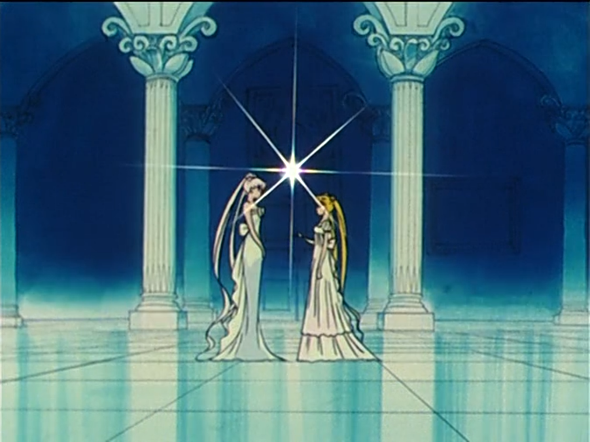 舊版動畫中則是先有一段母女對話,銀水晶再慢慢掉落到已經壞掉的胸針裡,才形成水晶之星。