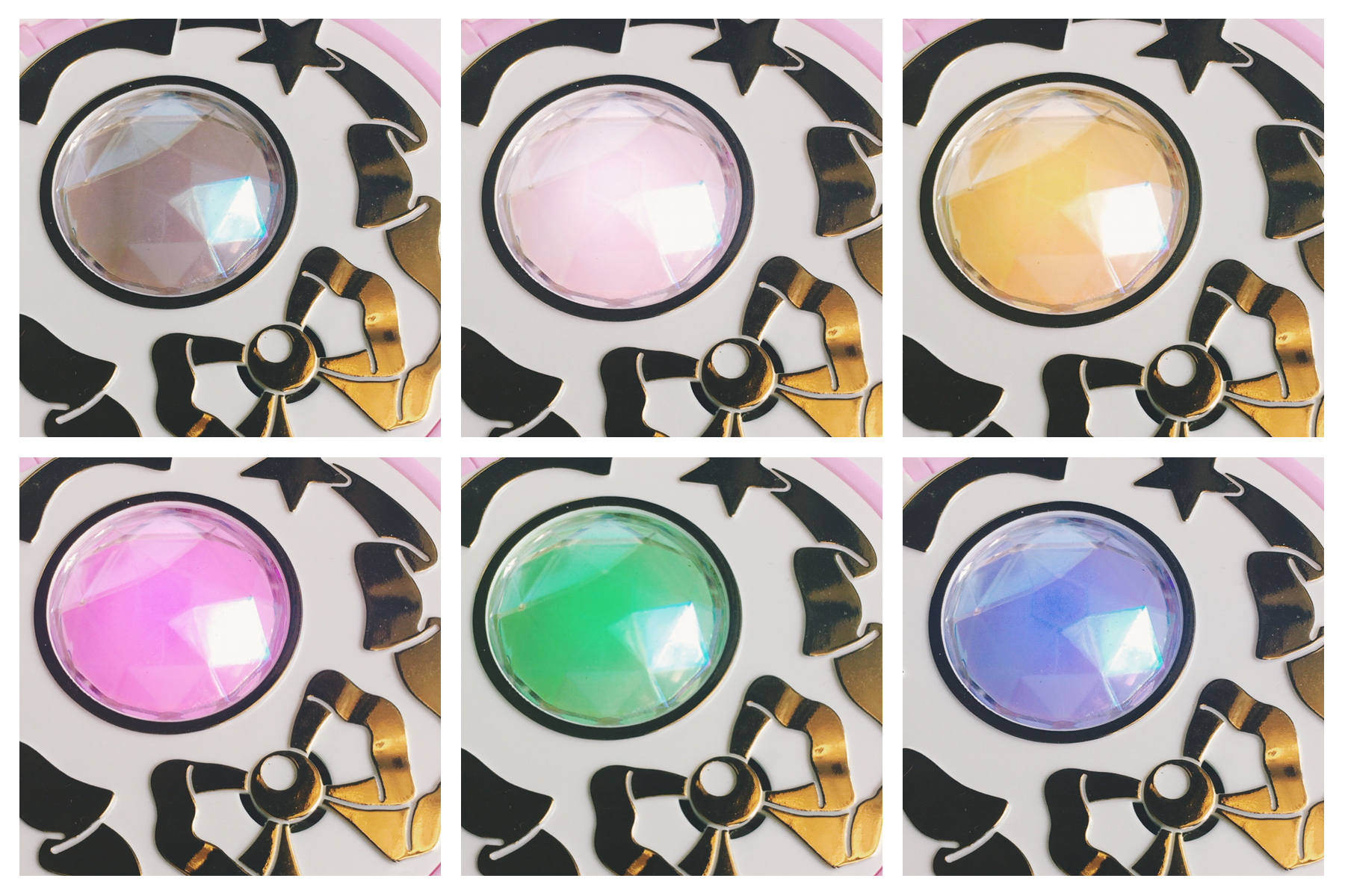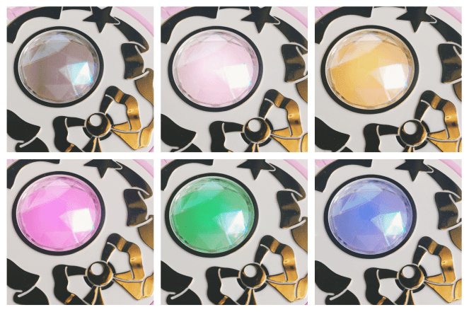 中間的銀水晶平常時是霧狀的銀粉色,帶著珠光很夢幻。啟動時配合音效也會出現不同的燈光顏色效果。