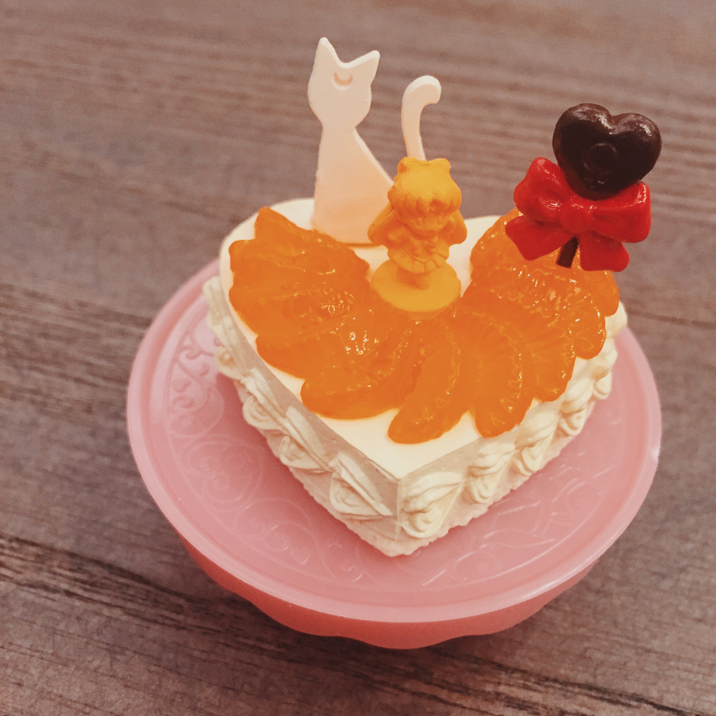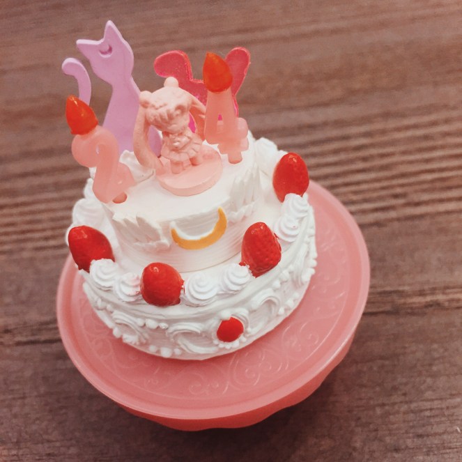 小兔的鮮奶油草莓蛋糕看起來好誘人喔,上面有露娜跟一支兔兔形狀的焦糖片。最下層的鮮奶油擠出了新后西蕾妮蒂的后冠,第二層則是做出了超級水手月亮的頭飾。小兔的這一組設計得很用心,不愧是故事主人翁。