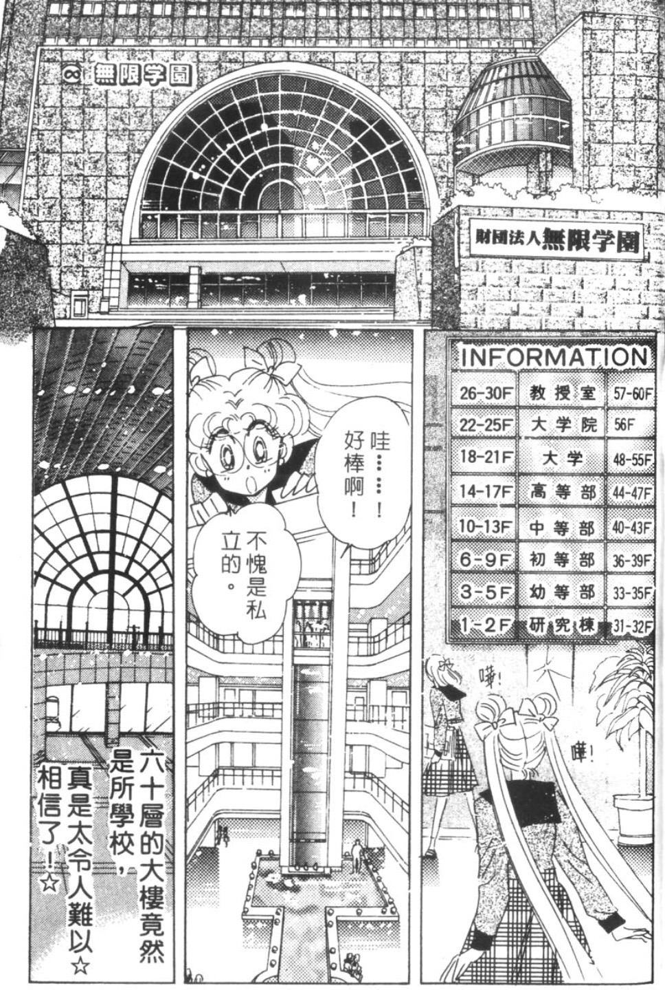 無限學園是從幼稚園到小學、中學、高中、大學,一路升學到研究所的高級菁英學校,漫畫裡說有60層樓之高。