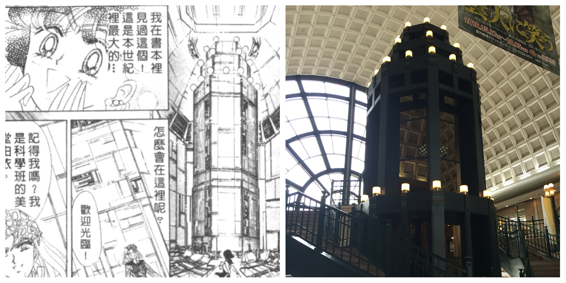 不過其實劇場本身只有對外開放兩層樓而已啦,沒有漫畫中描述的60樓那麼高。前面這輛電梯並非直通雲霄,而是只達B1、1、2F而已。