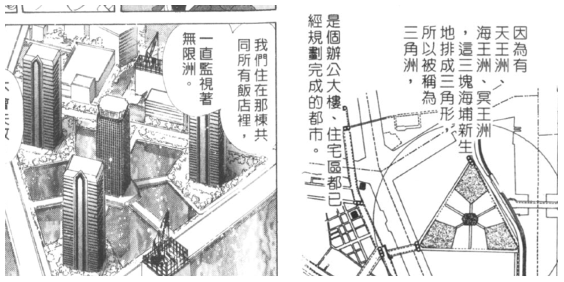 在等車的時候透過車站窗戶還是可以看到無限學園,這個角度就可以看到圍繞在它周邊的三棟高樓。也就是漫畫中阿遙、小滿、雪奈住的三棟飯店。