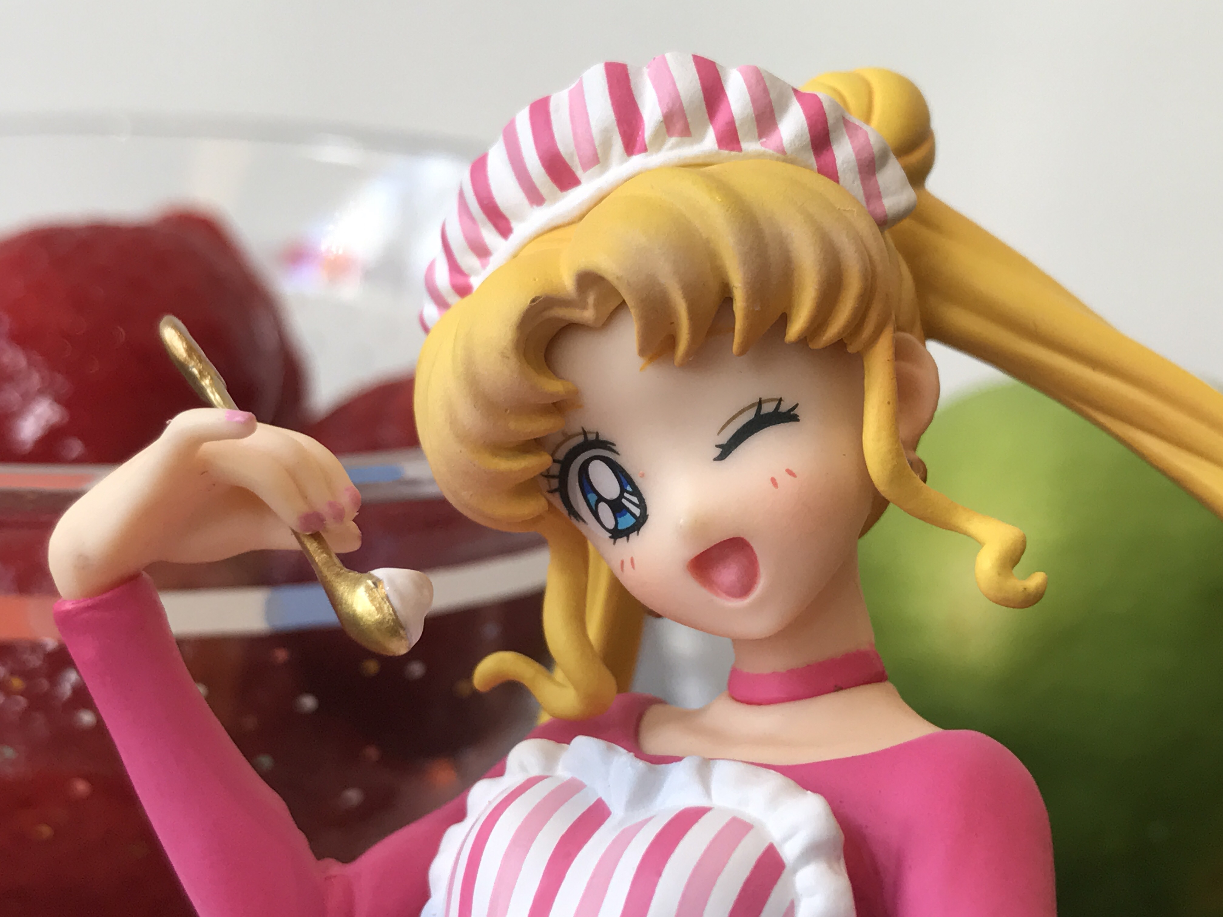 後來發現它其實是被黏在箱子裡,今天拍照時就把它裝上去了(不是很好固定,有點鬆動),上面舀了一匙鮮奶油,好像準備送進口裡的姿勢,可愛~~