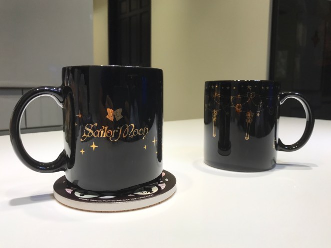 馬克杯有兩款,單價499元,箱子的外面會貼圖案的款式。一款是變身棒跟武器,另一款有水手月亮的剪影。