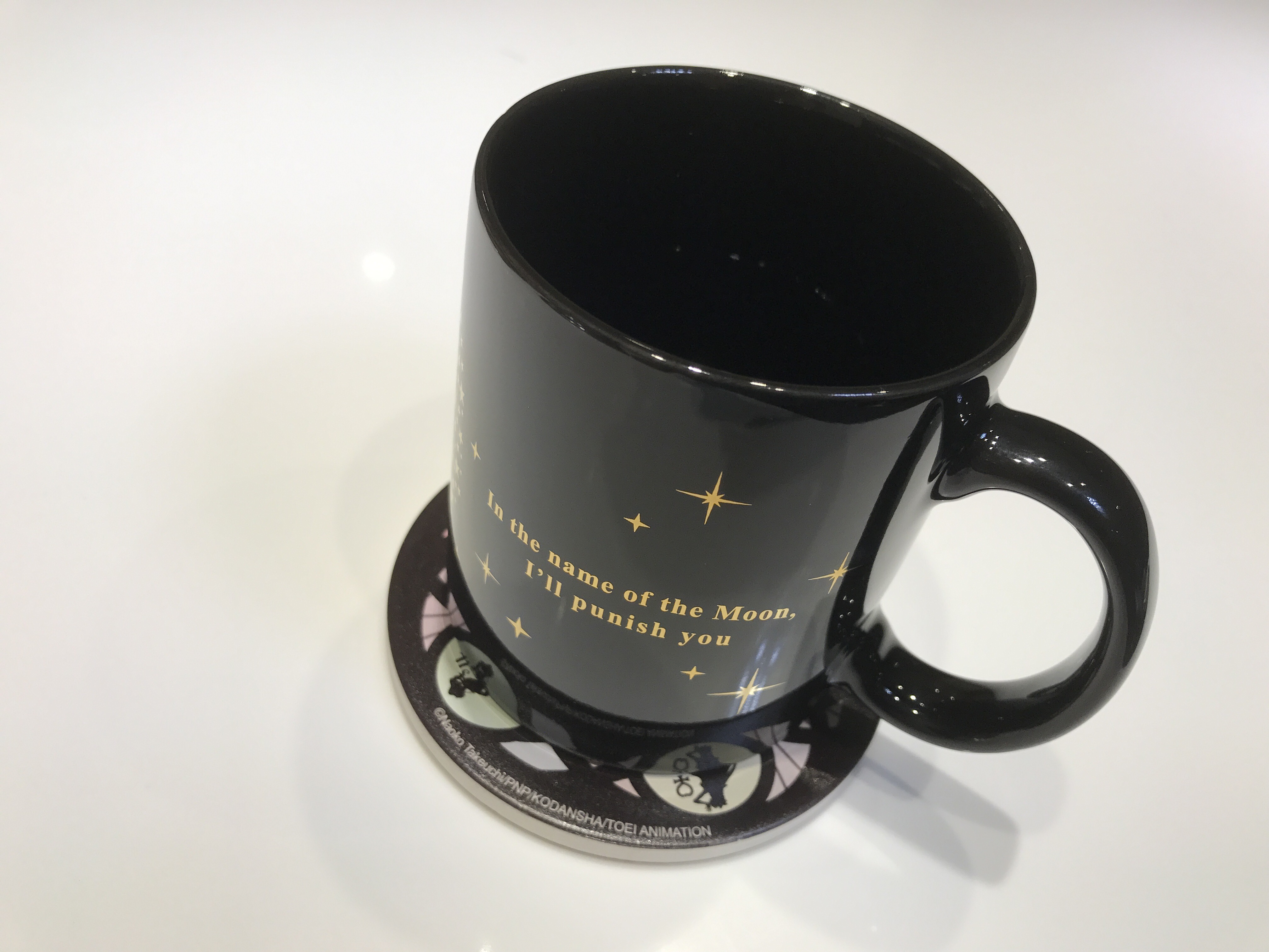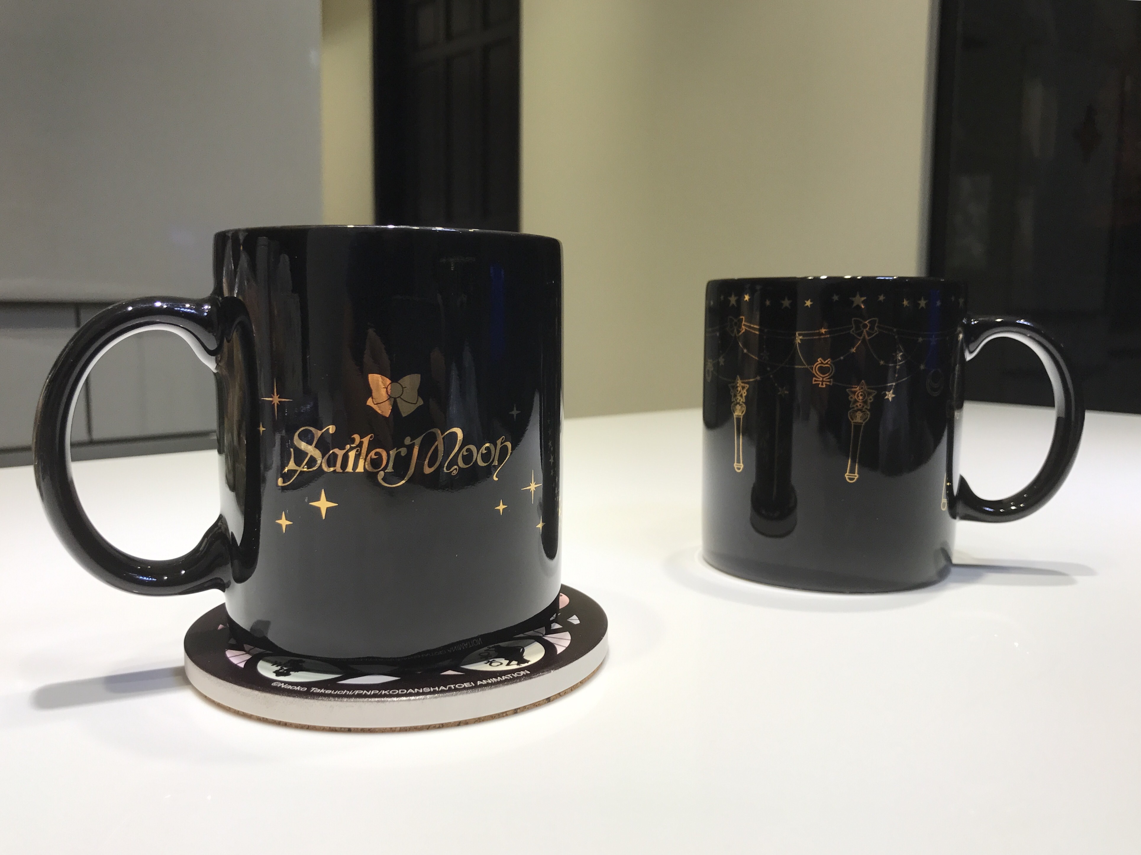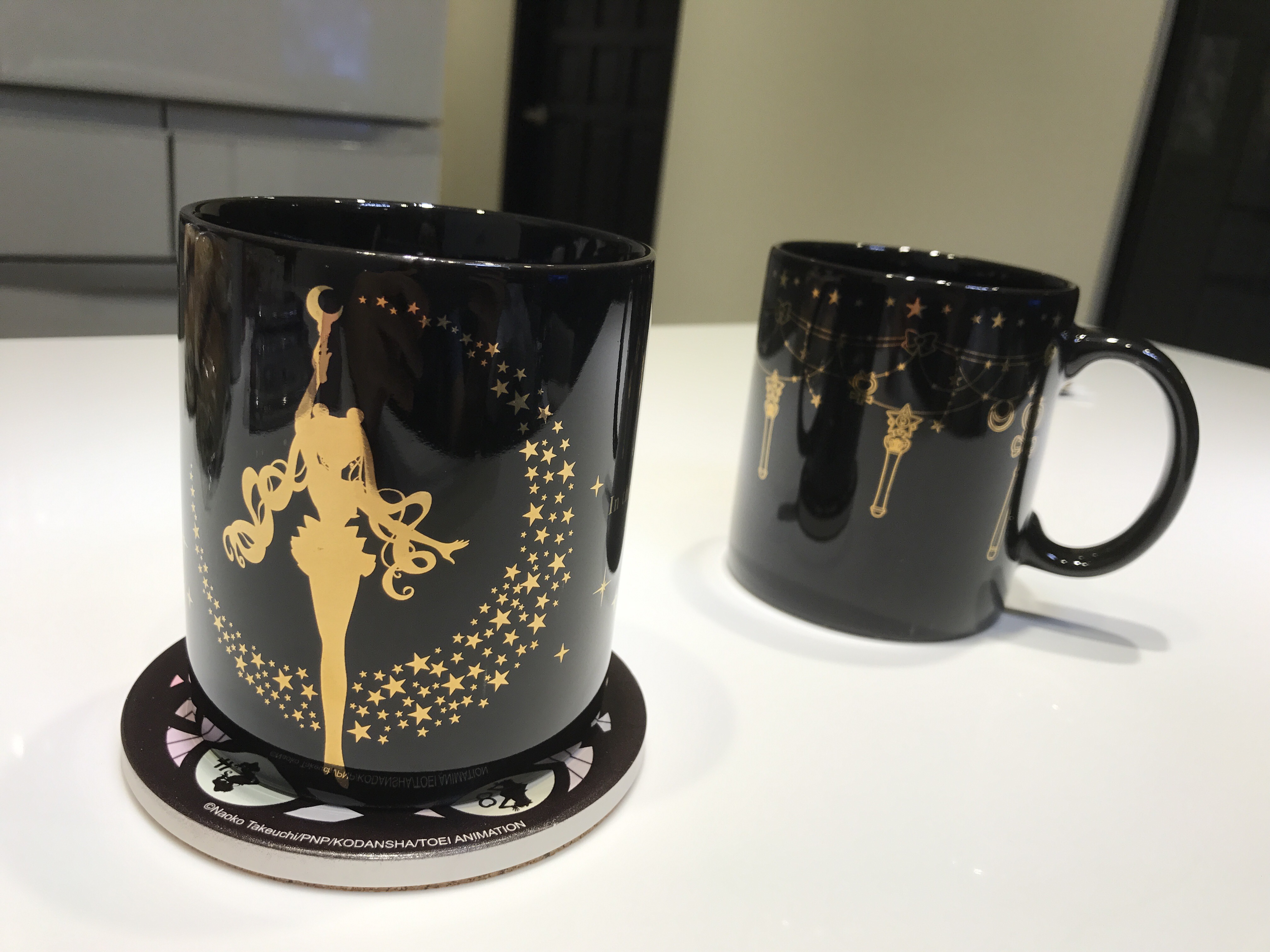 馬克杯有兩款,單價499元,箱子的外面會貼圖案的款式。一款是變身棒跟武器,另一款有水手月亮的剪影。