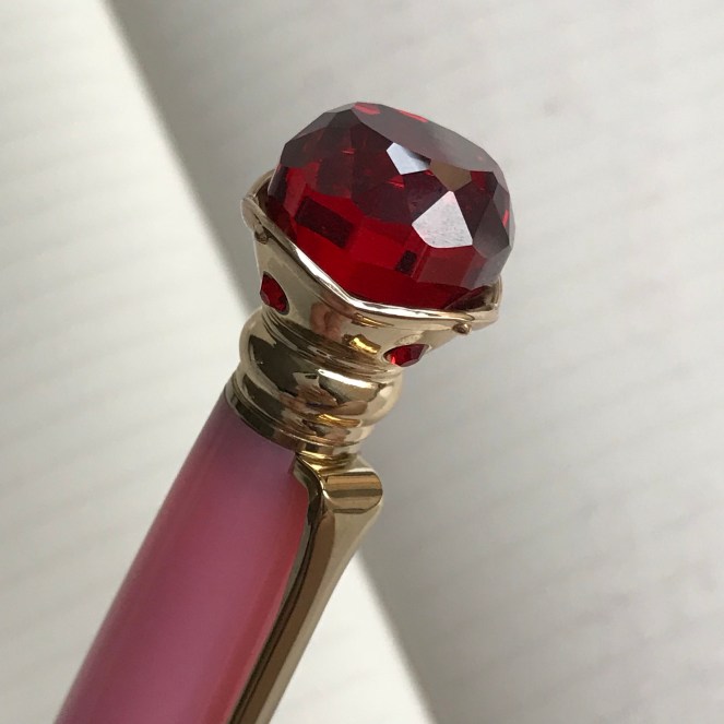 最令人期待的就是筆蓋上的紅寶石了!玻璃製的,隨著轉動會折射光線,隱隱約約的透明度,很好看!
