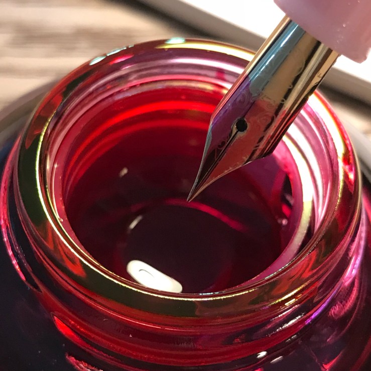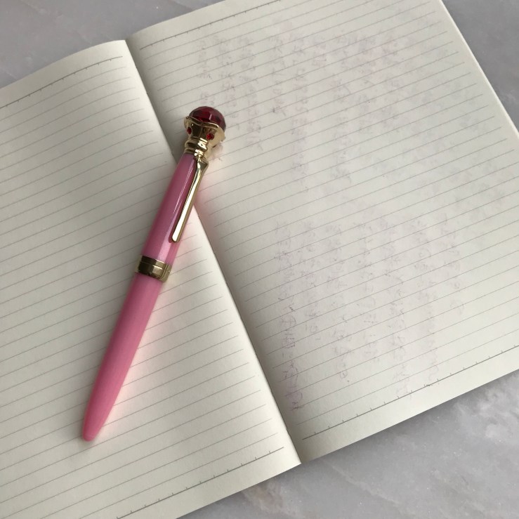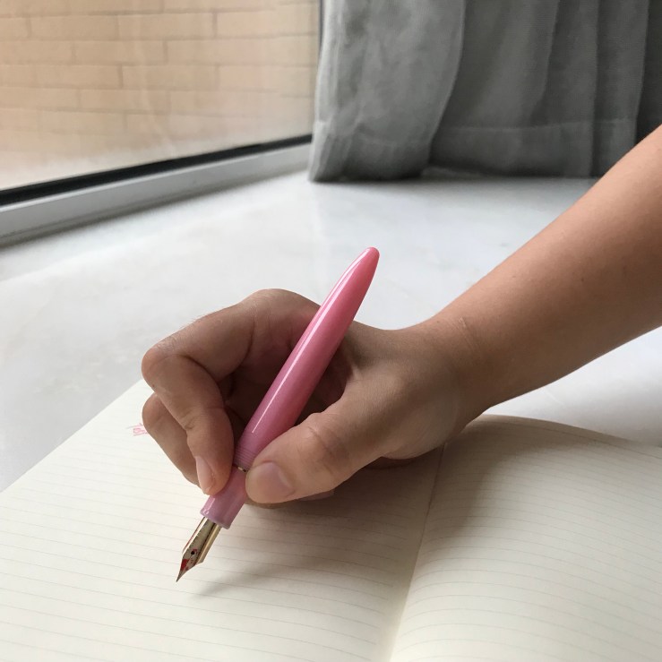 其實當初在看宣傳圖時我對於這顏色沒有太大好感,以日常書寫來說我覺得粉紅色不太實用,不過實際收到後看,它的粉並不是很刺眼的粉,黃光看看,是帶一點點橘紅感的硃砂紅,就覺得也還是蠻耐看的。