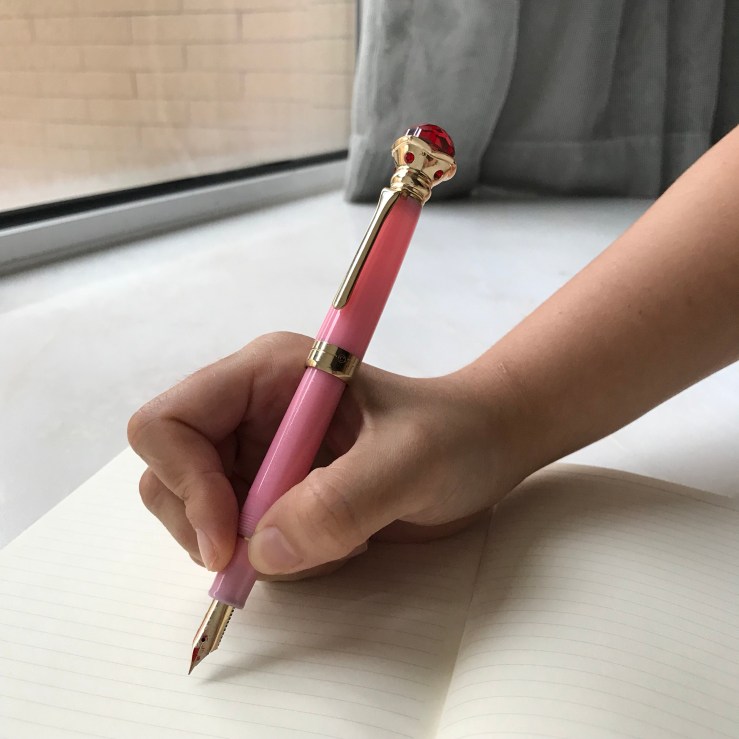 筆蓋是可以套在後面的,不過我不喜歡這樣,怕磨損筆身,而且變裝筆的寶石蠻重的,寫起來的重心不好抓,所以寫字時還是會只拿筆身,感覺就跟一般寫樂的鋼筆一樣。