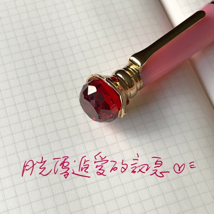 最令人期待的就是筆蓋上的紅寶石了!玻璃製的,隨著轉動會折射光線,隱隱約約的透明度,很好看!