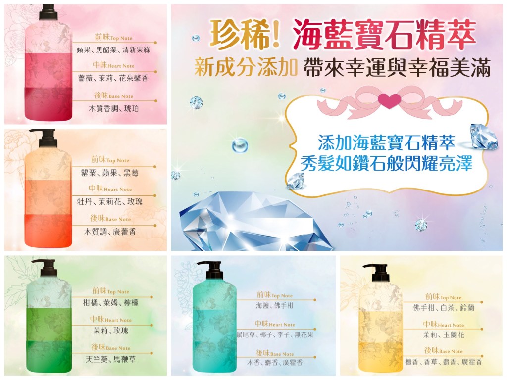 第一印象結束後我就有去看香調表了,這邊也附上讓大家參考。至於美吾髮說他們在洗髮精裡面加入了海洋寶石精萃,這個我是沒什麼感覺www